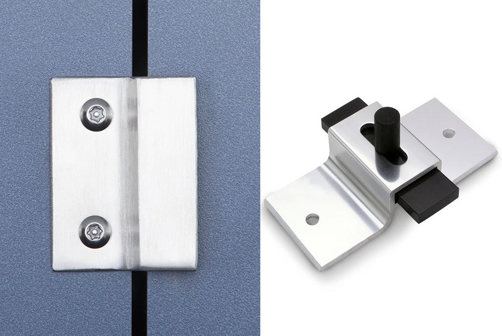 The door stop consists of a wrap-around strike and keeper and the door lock is a stainless steel surface mounted latch.