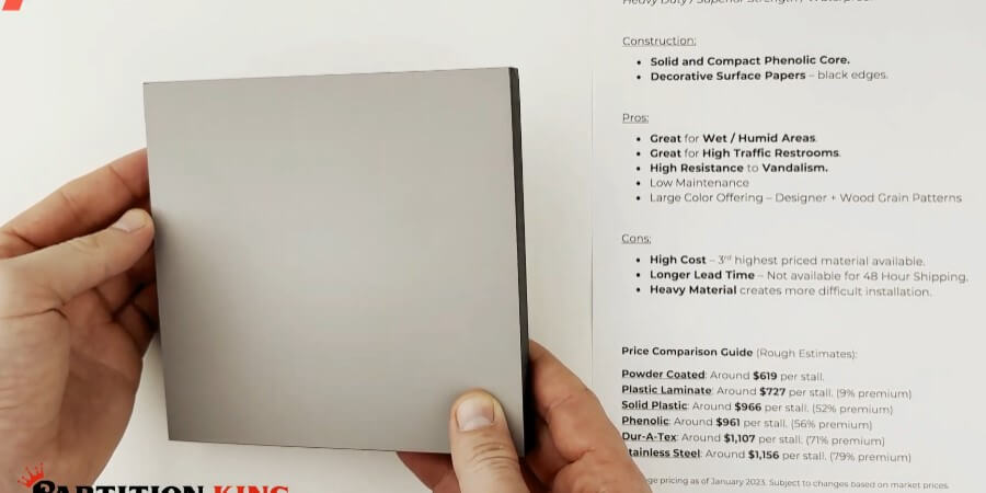 HEAVY DUTY / SUPERIOR STRENGTH / AVG. $1,180 PER STALL Phenolic bathroom stalls are made for high traffic, humid, and full water contact environments yet are available in sophisticated colors and wood grain / pattern finishes. The material has a one-piece, solid, and compact core that provides superior strength and damage resistance in vandalism prone environments. If you are seeking a heavy duty, water-proof beast, you have met your match! To receive a quote on your project, please email sales@partitionking.com or call 800-685-7541 to speak to an estimator.